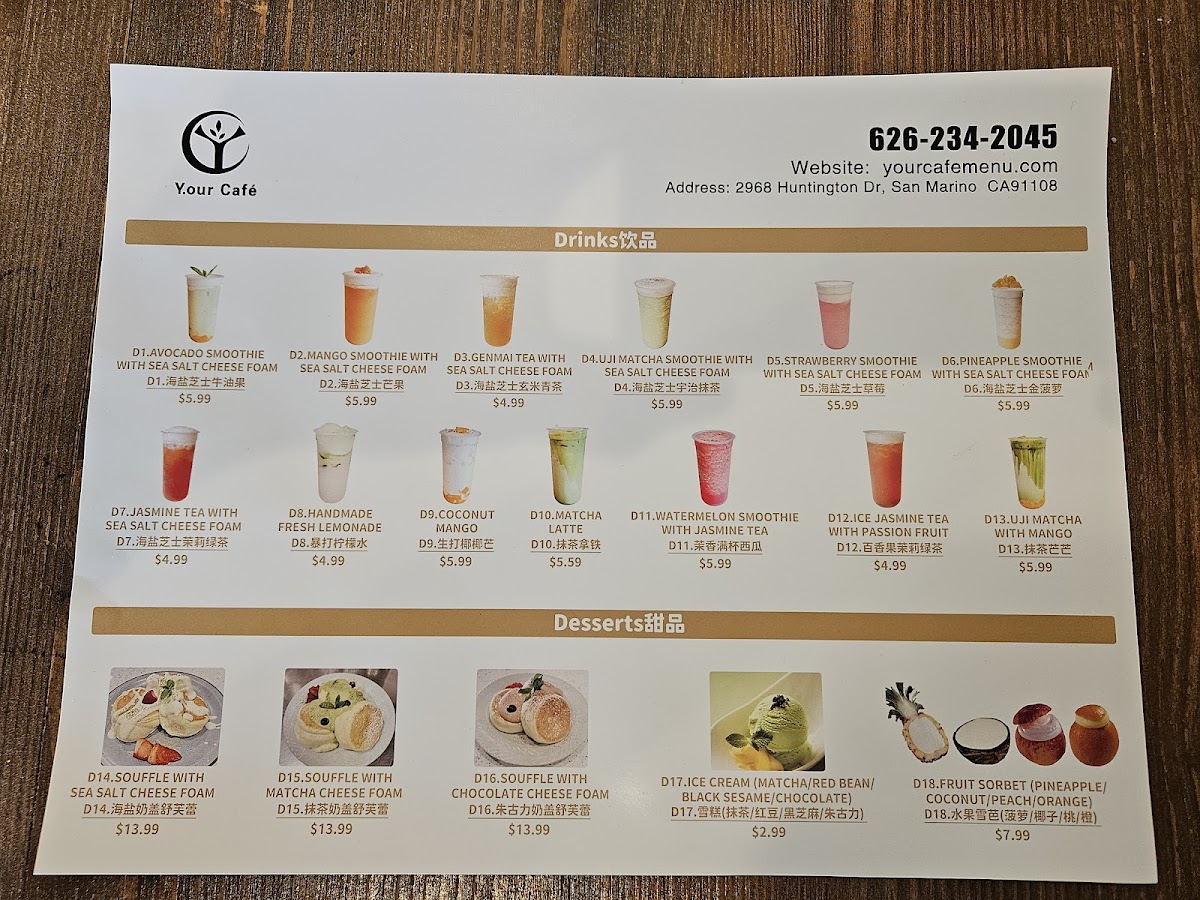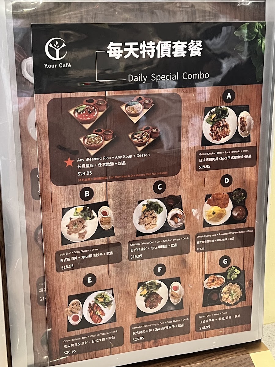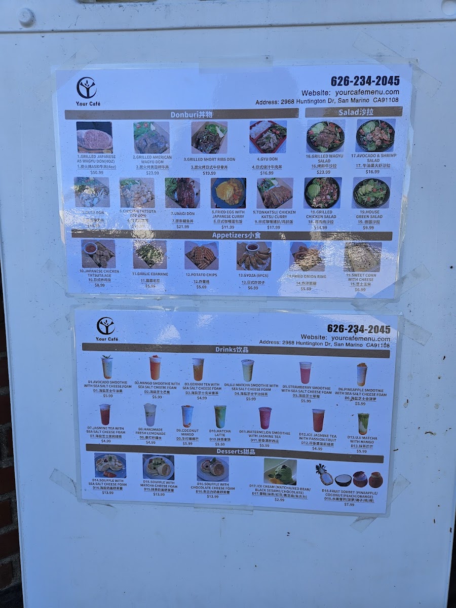 From the menu at Y.our Cafe, the offerings span hearty donburi bowls like Grilled American Wagyu Don, Grilled Short Ribs Don, Gyu Don, Buta Don, and Japanese Chicken Tatsuta Age, to fresh salad options such as Grilled American Wagyu Salad, Grilled Short Ribs Salad, Avocado Shrimp Salad, Grilled Chicken Salad, and the simple House Green Salad. Appetizers include crowd‑pleasers like Takoyaki 6pcs, BBQ Chicken Wing 6pcs, Roti Canai With Curry Sauce, Japanese Chicken Tatsuta Age, and Garlic Edamame. Their drink list features a playful twist on classics with smoothies topped with sea salt cheese foam - Avocado Smoothie With Sea Salt Cheese Foam, Mango Smoothie With Sea Salt Cheese Foam, Uji Matcha Smoothie With Sea Salt Cheese Foam, Strawberry Smoothie With Sea Salt Cheese Foam, and Pineapple Smoothie With Sea Salt Cheese Foam. For noodle lovers, choices range from refreshing cold options like Zaru Soba Cold, Grilled Short Ribs With Zaru Soba Cold, Grilled Chicken With Zaru Soba Cold to warming bowls such as Miso Soba Noodle Soup and Grilled Short Ribs With Miso Soba Noodle Soup, making the menu both varied and appealing.